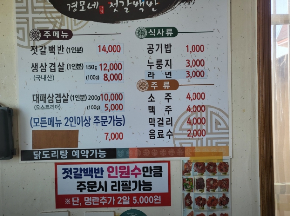 경모네 젓갈백반 메뉴
