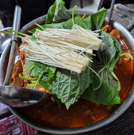 - 진하고 깊은 국물: 자극적인 조미료 맛보다는, 오랜 시간 우려낸 사골 육수의 깊고 구수한 맛이 일품입니다. 깻잎과 들깨가루가 듬뿍 들어가 향긋함과 고소함을 더해줍니다.