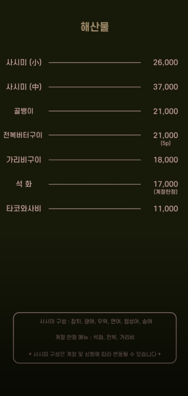 • 사시미: 구이뿐만 아니라 신선한 사시미도 준비되어 있어, 날것과 익힌 것의 조화를 즐길 수 있습니다.