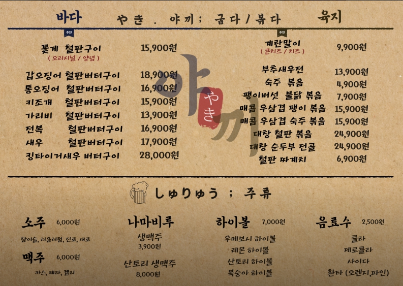 '야끼'는 마포구 홍대 입구 근처에 새롭게 문을 연 철판요리 주점입니다. "비싸서 먹기 힘든 철판요리를 가성비 있게!"라는 슬로건으로 누구나 부담 없이 즐길 수 있는 것이 특징입니다.