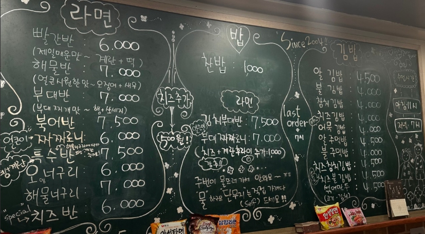 • 빨간반 (매운 라면): 이곳의 시그니처! 혀끝을 때리는 강렬한 매운맛이 특징입니다. 단순히 맵기만 한 게 아니라, 깊고 진한 국물 맛 덕분에 땀을 뻘뻘 흘리면서도 젓가락을 놓을 수 없는 마성의 라면입니다.
