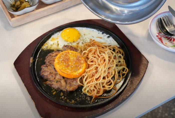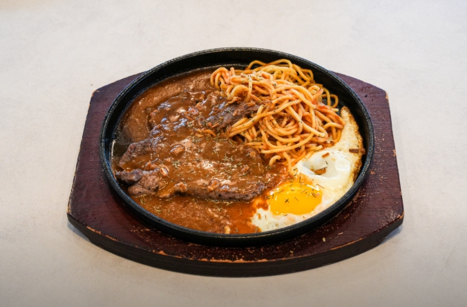 - 구성: 지글지글 끓는 철판 위에 소 등심 스테이크 + 중화면 + 계란 프라이가 한 번에 담겨 나옵니다.