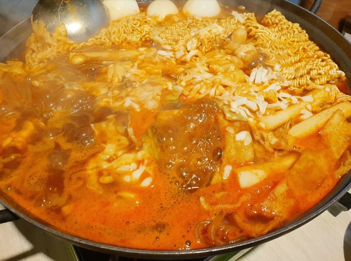 • 진한 짜장 육수: 일반적인 고추장 베이스가 아닌, 진한 짜장 소스가 베이스가 되어 깊고 감칠맛 넘치는 풍미를 자랑합니다.
