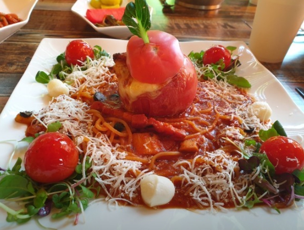 - 단호박 속에 매콤한 토마토 해산물 파스타가 들어갔습니다. 단호박의 달콤함과 소스의 매콤함이 '단짠단맵'의 정석을 보여줍니다. 스테이크와 함께 곁들이기 딱 좋은 메뉴!