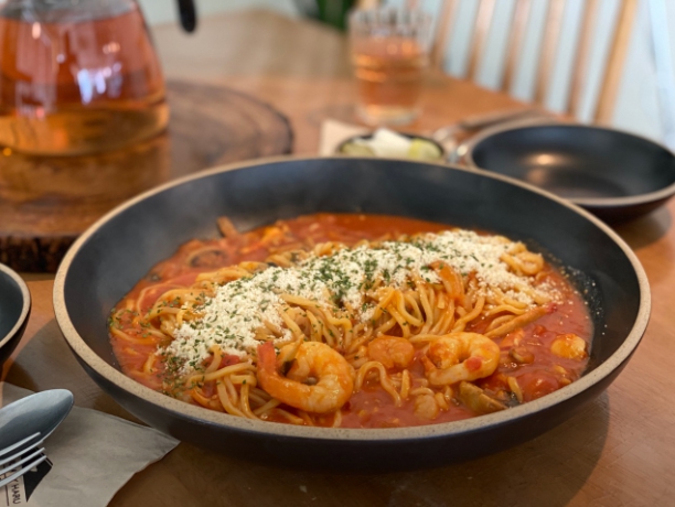 • 누룽지와의 만남: 얼큰하고 진한 토마토소스 파스타 아래에 구수한 누룽지가 깔려 있어, 바삭하고 쫀득한 식감 재미를 더해줍니다. 한국인의 입맛을 저격한 퓨전 메뉴입니다.