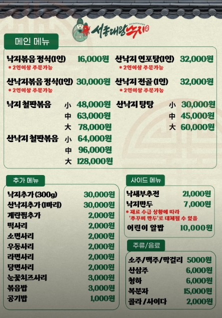 서종대왕낙지 메뉴