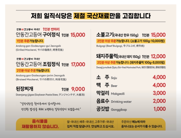 - 메뉴 조합: 구이와 조림을 골고루 드셔보세요. (조림은 2인분 이상 주문 가능) 조림을 주문하고 구이는 단품으로 추가할 수도 있어요!