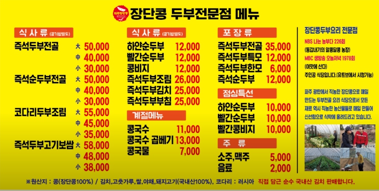 이곳은 100% 국산 파주 장단콩과 농산물을 직접 농사지어 사용하는 믿고 먹는 식당입니다. 이미 다수의 방송에 출연하며 '전설의 두부'로 인정받은 곳이죠.