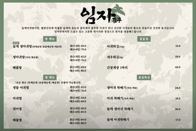 - 특징: 국내산 1등급 들깨가루를 사용해 걸쭉하고 고소한 풍미가 일품입니다. 보양식 느낌을 원하신다면 들깨탕 강추!