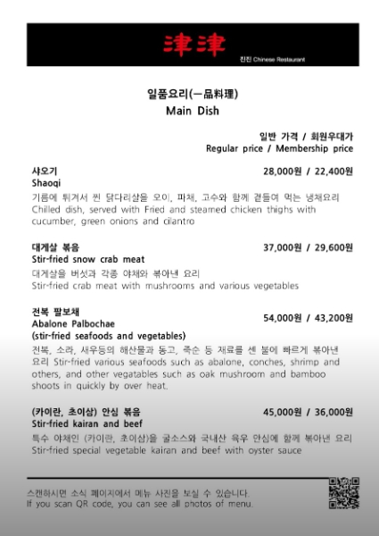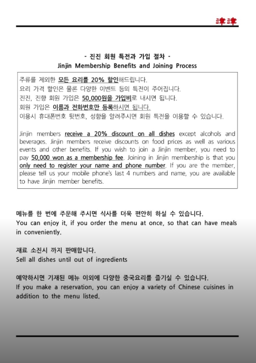 - 회원제 혜택: 3만 원을 내고 평생회원에 가입하면 모든 요리를 20% 할인된 가격에 즐길 수 있습니다. (자주 간다면 무조건 이득!)