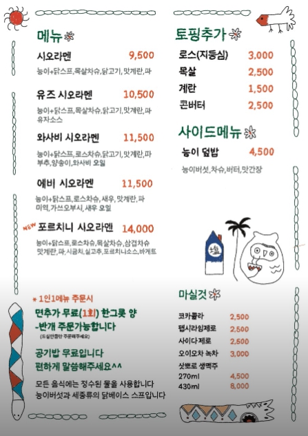 - 다채로운 변주: 기본 시오라멘 외에도 유자, 레몬, 와사비 등 상큼한 향을 더한 라멘들이 있어 취향대로 골라 먹는 재미가 있어요. 🍋