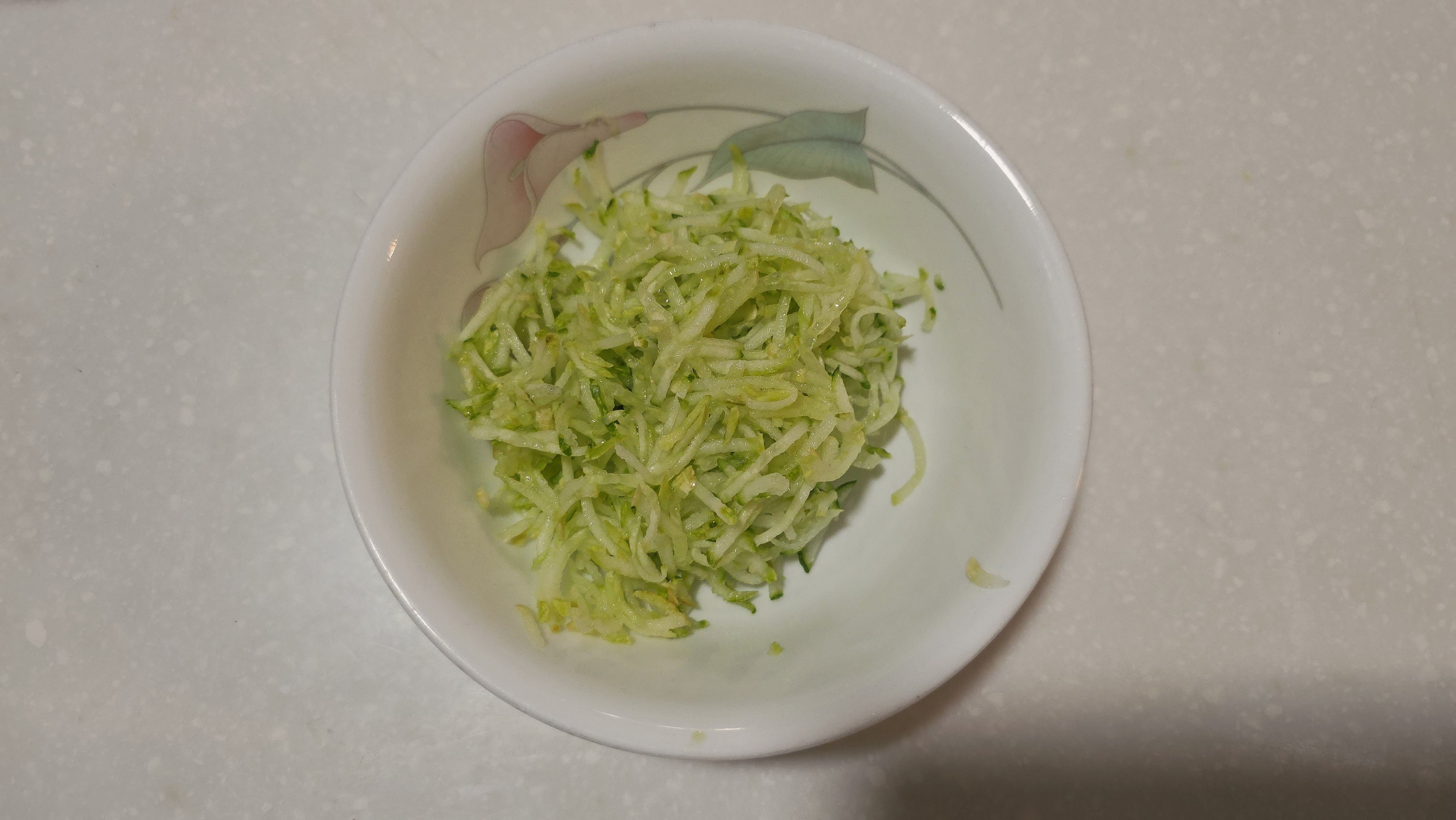 2. 다진 오이에 소금을 살짝 뿌려 5분 정도 둔 뒤, 키친타월로 물기를 꼭 짜줍니다.