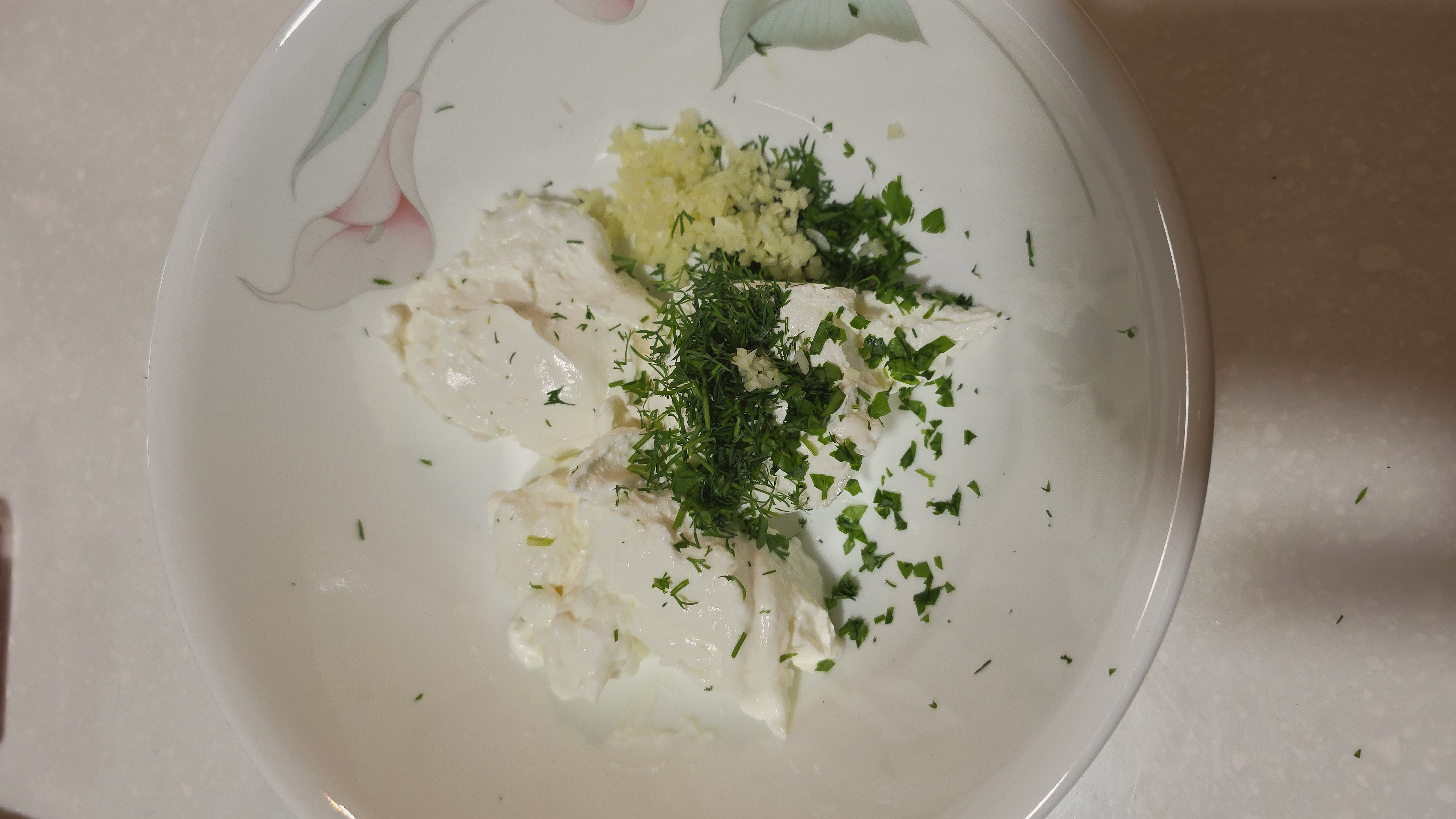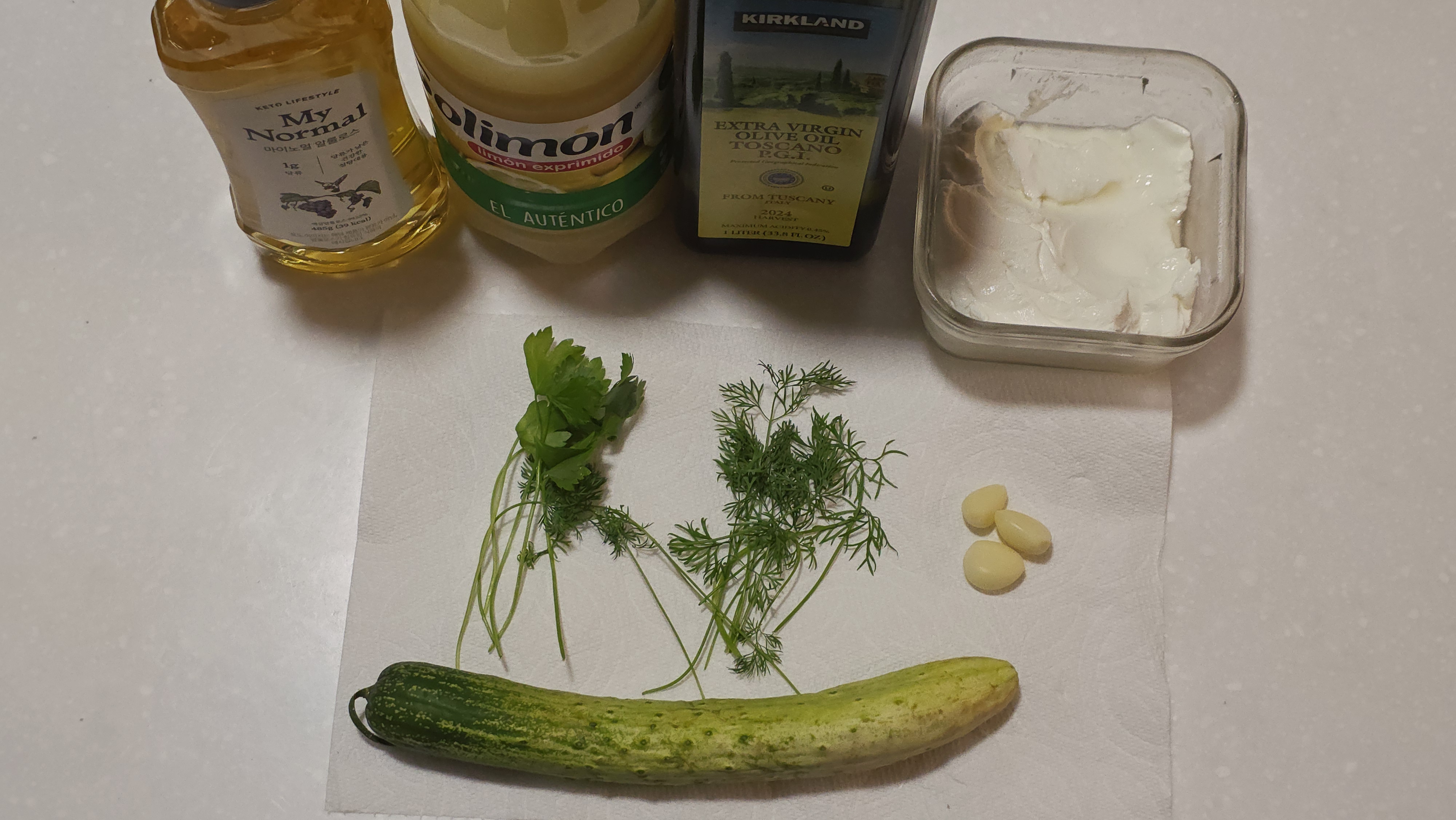 3. 볼에 그릭요거트, 다진 마늘, 레몬즙, 올리브오일, 소금, 후추를 넣고 섞습니다.