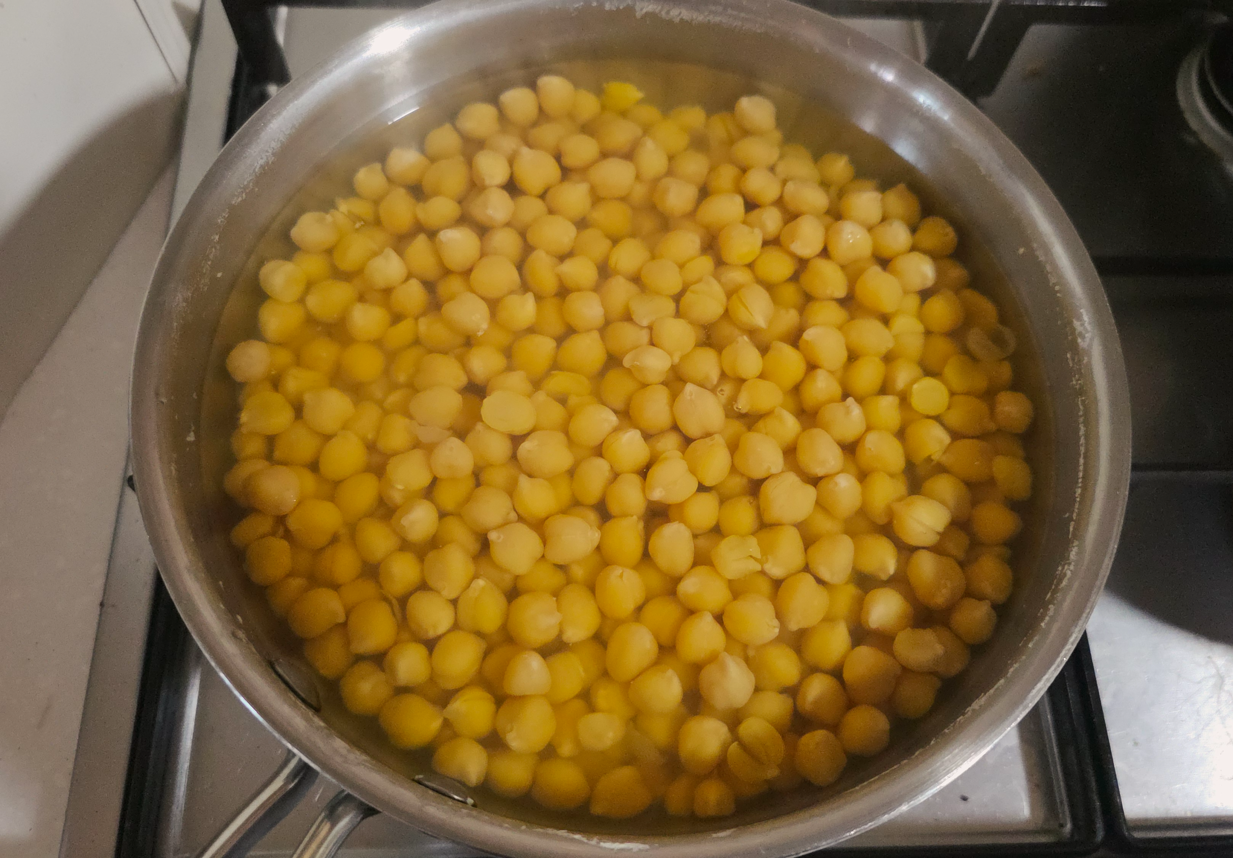 불린 병아리콩을 냄비에 넣고, 콩이 충분히 잠기도록 물을 부어주세요.