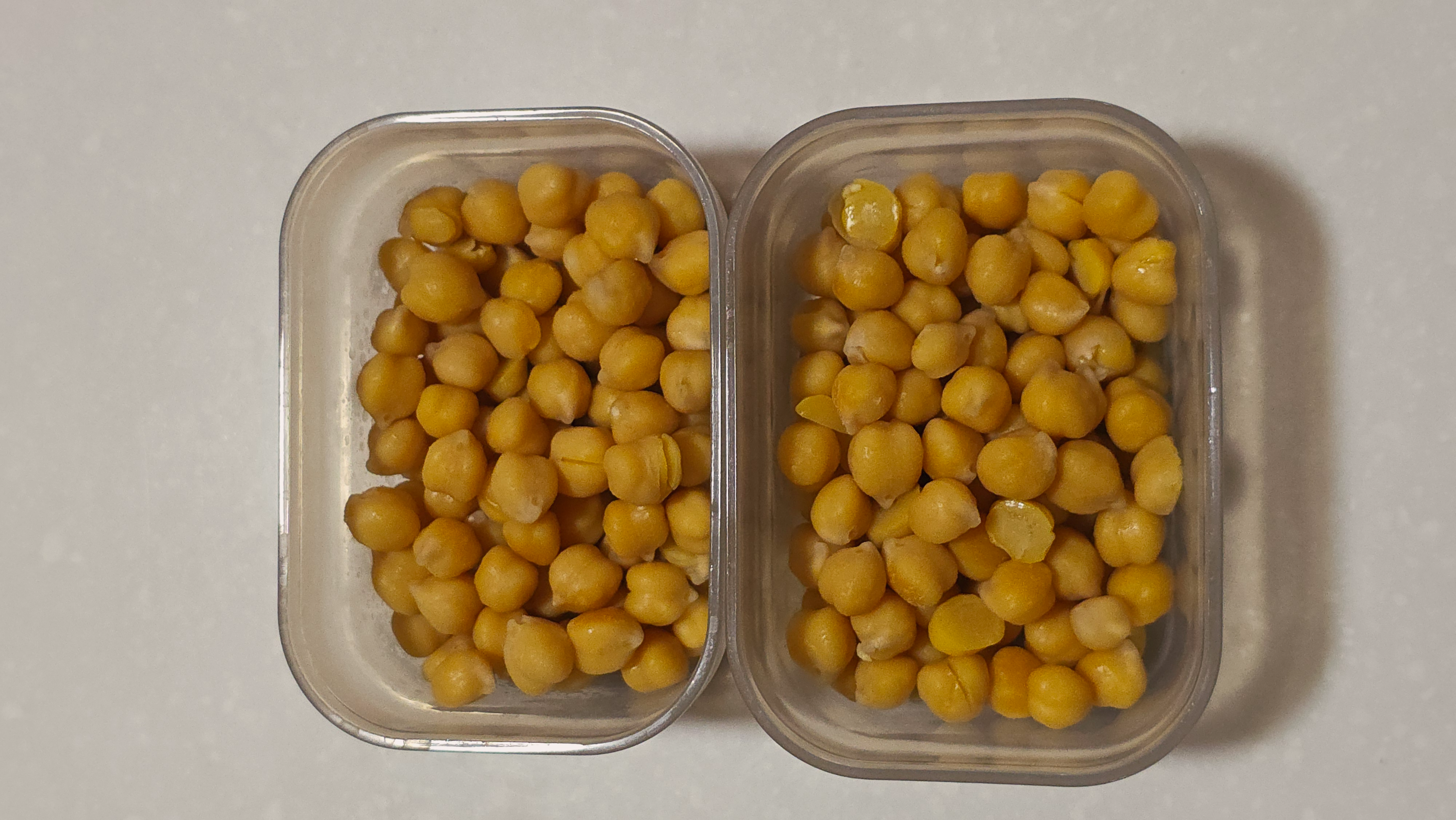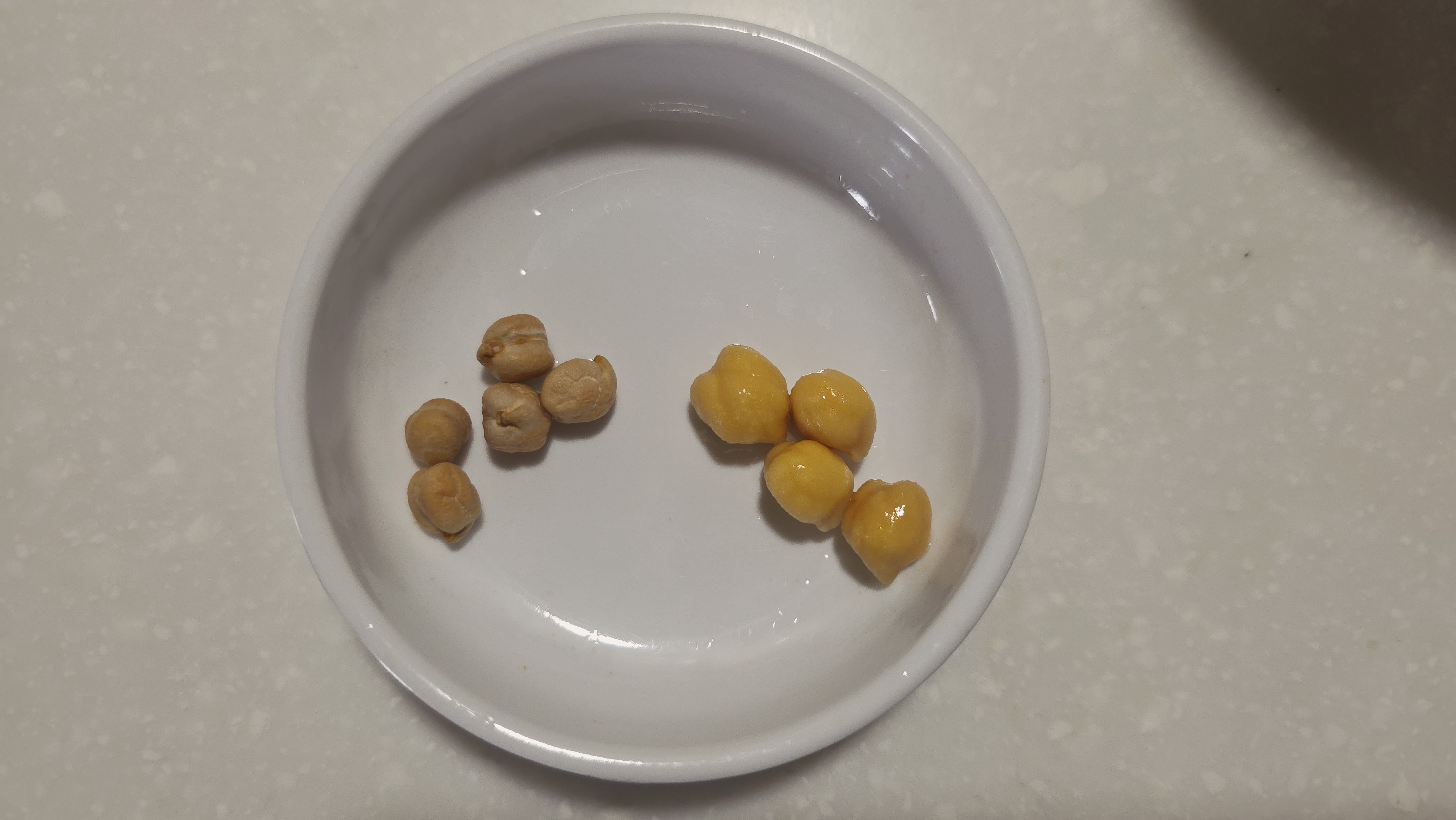 하룻밤 불린 병아리콩이에요. 크기가 커진 게 보이시나요?