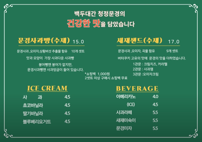 - 문경사과빵 (15,000원) 문경 산지 사과를 활용해 속에 달콤하고 향긋한 사과 앙금이나 필링을 넣은 프리미엄 수제 사과빵