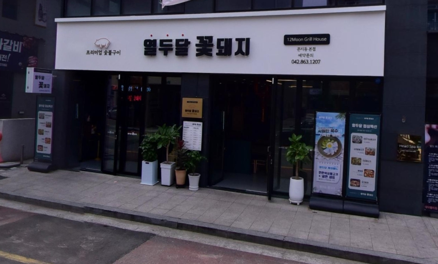 '열두달꽃돼지'는 대전 유성구 전민동/문지동 상권가에 위치해 있으며, 점심에는 해장국과 식사류, 저녁에는 고기와 술자리를 즐기기 좋은 곳입니다.