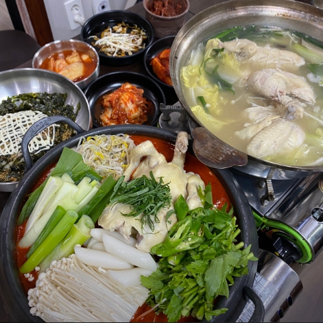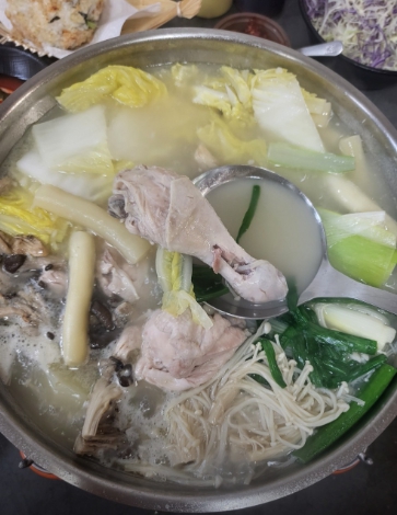 - 메뉴 소개: 신선한 닭 한 마리가 통째로 들어가며, 진하고 깊게 우려낸 육수에 부추, 감자 등 채소를 곁들여 끓여 먹는 보양 전골 메뉴입니다.
