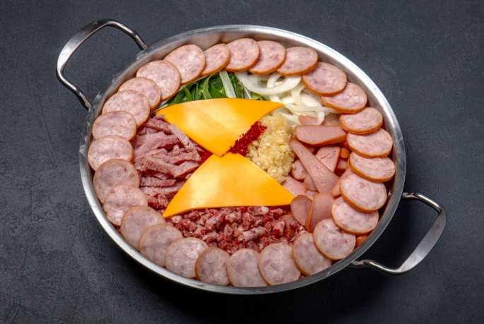 - 메뉴 소개: 다양한 햄과 소시지, 베이컨, 민찌, 치즈, 그리고 직접 담근 김치와 대파, 마늘이 듬뿍 들어간 메인 메뉴입니다.