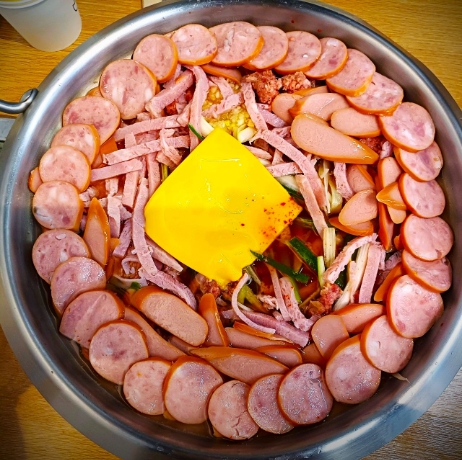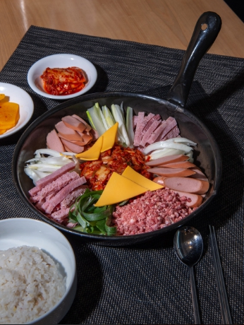 - 메뉴 소개: 다양한 햄과 소시지, 베이컨, 민찌, 치즈, 그리고 직접 담근 김치와 대파, 마늘이 듬뿍 들어간 메인 메뉴입니다.